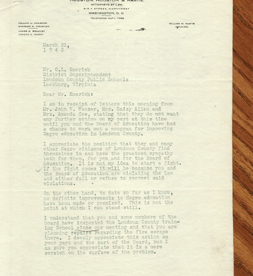EWP 01 March 16, 1940 page from Houston, Houston & Hastie letter to Superintendent Emerick on school bus transportation for Black students March 16, 1940 page 3 of a letter from the law firm of Houston, Houston & Hastie to Superintendent OL Emerick. In face of the inequities in school bus transportation between Black and White students, this page discusses "the obligation of the county to furnish Negro school children bus transportation on equal terms with white children similarly circumstanced."