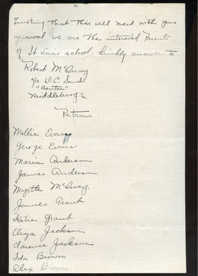 Estimated date = 1930s. The petition requests school bus transportation for colored students to the 'Loudoun County Training Center' it's assumed to be Pre-Douglass High School (1941). Students are from Willisville, St Louis, Middleburg Colored, Bull Run (Aldie) and Gleedsville (Mountain Gap Colored). Additional petition signees to those in 'EWP 02-5 A Yr Unknown Petition for school bus transportation for colored students to the Loudoun County Training Center', otherwise it appears to be the same petition.
