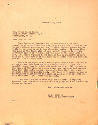 EWP 2-5B Yr 1926 July Correspondence between O.T Emerick and Harris Hart - Decision of Virginia State School Board not to intervene in Lincoln-Purcellville School location issue. Two letters dated July 1926 between Superintendent Emerick and Harris Hart, Superintendent of Public Instruction regarding the location of the Lincoln-Purcellville High School. The issue was brought before the circuit court, which ruled that the school trustee electoral board had jurisdiction. The first letter is addressed to Superintendent Harris Hart dated July 1, 1926 from Superintendent Emerick. (missing second page.) The School Board Trustee electoral Board decided to hear the case on July 9th. The board passed a resolution requesting a committee of 3 make careful study of the matter and make recommendations regarding the school's location. It was advised this committee would have experts whose expenses were already budgeted to cover their expenses. The second letter (O.T Emerick to Harris Hart) The committee of three was made up of Mr. Combs, Mr. Smithey and Mr. Hoke. However, a memorandum report by this committee suggested the dispute was local between these two communities. This lead the Department of Education to decline involvement. (Last 2 pages are duplicate pages.)