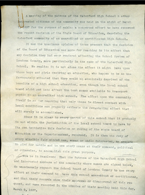 EWP 2-5-B Yr 1930 Waterford Protest that Waterford will not be an accredited High school At a meeting of the citizens of Waterford, Va. and community, on March 13, 1930 called for the purpose of discussing the proposed changes contemplated being made in our schools of Loudoun County, after receiving a copy of the recommendations from the County Survey Committee, the following Committee was appointed to act in behalf of the Waterford High School as they may deem fit. Rev. John A. Bowman, Talbot E. Pierce, William S. Smoot, Douglas N. Myers, W.I. Mann, James Carr. C.N. Mason, R.E. McCarty, Frederick Stabler, immediately after the adjournment of this meeting the above named Committee met and formulated the following appeal to the School Board of Loudoun County, at its meeting to be held on March 18, 1930 in the School Auditorium at Leesburg, Va. (1) We respectfully appeal to you to keep the Waterford High School on the accredited list of high schools. Here is a good school, fully equipped and serving well a rural community, which enjoys none too many advantages. It would be a step backward in education to take away a high school that has been established over twenty years and deprive the pupils of the advantages they are entitled to have, and for which we pay taxes. Gov. Pollard recently said "Education is the foundation of the whole state, to be exercised for the benefit of all children within its borders. The Waterford High School is not to blame for having under thirty-five pupils this year. We now have an excellent Principal and good teachers. We have reasons to know that if allowed to continue as at present, we will have the allotted number of pupils for the school term 1930-31, (2) We suggest a zone system and recommend that children in these zones attend their respective schools. (3) We are opposed to the consolidation of schools, and bus transportation as morally detrimental to the children of any community But in event consolidation of smaller schools is more fully carried out. we urge that the schools at Wheatland, Paeonian Springs and Clarks Gap, be consolidated with the Waterford school. (8) For the educational benefits of Loudoun and its present and future welfare we are unanimously opposed to the practice of employing an itinerant teacher. Respectfully submitted. Rev. John A. Bowman, W.S. Smoot, ( (Committee) W.I. Mann, C.N. Mason, R.E McCarty, Fredk. Stabler, Talbot E. Pierce, Douglas N. Myers, James Carr.