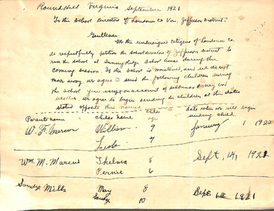 February 9, 1924 petition from patrons of Bluemont students attending Round Hill High School for school bus transportation.
