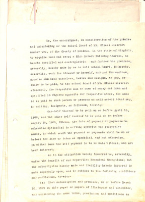 EWP 2-5B Yr 1909 Feb Subscription to Lincoln HS In February 1909, members of the community in Mt. Gilead District number two, Loudoun County, Virginia, signed a document committing to financially support the acquisition of land and construction of a new High School Building. The signatories pledged to pay specified sums, with half due by April 15, 1909, and the remaining half by August 15, 1909. They agreed to waive the benefit of their respective Homestead Exemptions for this obligation. The School Board was to gather at least EIGHT THOUSAND DOLLARS in subscriptions by parties deemed financially able and planned to select a suitable location near the crossroads in Lincoln for the new school building. The total cost of the project, estimated at TWELVE THOUSAND DOLLARS, would be funded through various means, including the sale of existing school property and potential taxation. This document, signed on February 26, 1909.