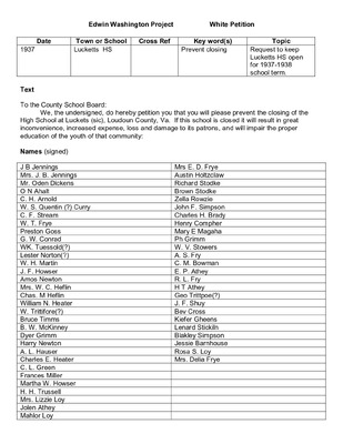 White Petition Arlington Unk Date Closing White Petition probably from 1936-1937 school year requesting that the Arlington school not be closed. J.E.L (Jacob Edward Lee) Cooper, HL Cooper, Hazel Gertrude Talton White, Thos.(Thomas)R (Randolph)White, John E. Shoemaker (Shumaker), Edith Mae Elizabeth Jacobs Shoemaker (Shumaker) George Washington Simpson. Mary Virginia Simpson. Ed (Edgar) (M) McLinn Baker Bessie V. Baker M. (Mary) Blanche Frye Danner Elevin F. (Franklin) Danner (Lucy) Cecilia Kelley Danner Oliver Noble Danner Carl W. (Washington) Frye (Fannie) Veta Jacobs Frye Eppa R. (Raymond)Frye Florence M. Virts Frye Mrs. Albert Allenomer? Carrie Elizabeth Wilt Kelley Charles Richard Kelley, Bessie (Alvira)Tribby Orrison -