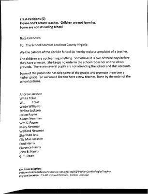 EWP 2-5A Petition Conklin 1952 Teacher Complaint This petition, dated April e, 1952, was submitted by patrons of the Conklin School to O.L. Emerick, Superintendent of Loudoun County Public Schools. The petition requests that a specific teacher not be retained for the following school term. The patrons express dissatisfaction with the teacher, stating bluntly, "She no good."