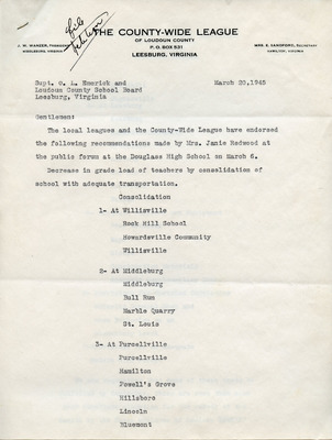 EWP 2-5A Negro Needs 1945 The County-Wide League response to March 6, 1945 public forum This petition from The County-Wide League responds to the March 6, 1945, public forum on educational equity and supports recommendations by Janie Redwood. The petition calls for reduced teacher loads through school consolidation, improved transportation, adequate supplies, and enriched curricula for Negro children in Loudoun County. It urges implementing some urgently needed measures by September 1945 to address safety and health concerns. The document also expresses appreciation for public discussion on educational opportunities under the segregated (Jim Crow) system and supports a proposed tax rate increase by the Board of Supervisors.