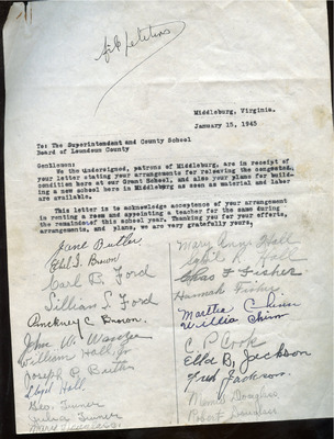 EWP 2-5A Grant School Patrons’ Confirmation Letter Regarding Temporary Relief Plan for Overcrowding (January 15, 1945) This letter, dated January 15, 1945, is addressed to the Loudoun County Superintendent and School Board from the patrons of the Grant School in Middleburg, Virginia. It confirms receipt of the School Board’s earlier communication and acknowledges the proposed plan to address overcrowded conditions by temporarily renting an additional room and appointing a teacher for the remainder of the current school year. The letter also reflects the patrons’ acceptance of the long-term plan to construct a new school once materials and labor become available.