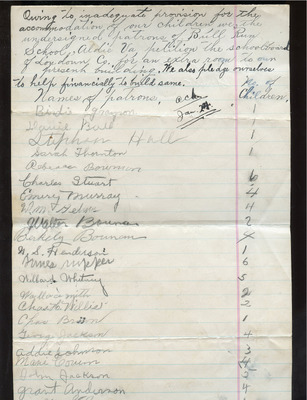 EWP 2-5A Hughesville 1928 Petition to Reopen School Dated June 28, 1928, this petition was submitted by parents and patrons of the Hughesville School to the Loudoun County School Board, requesting that the school re reopened. The petition cites the presence of twenty or more school-age children in the community in need of local educational access, as well as the names of the parents and patrons supporting the request.