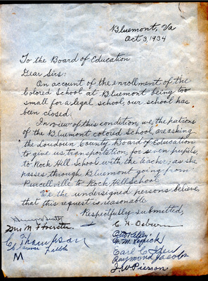 RCH 2-5A Petitions (C) Bluemont and Rock Hill transcript A petition requesting transportation for students and a teacher to Rock Hill School when Bluemont Colored School closed was signed by both black and white residents of the area.