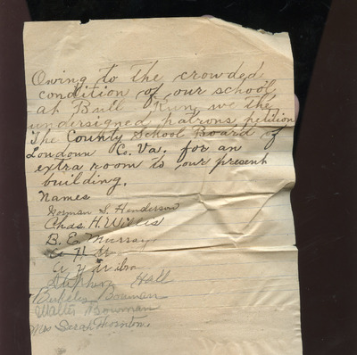 EWP 2-5-A Petition Bull Run This petition was submitted by patrons of the Bull Run School in Loudoun County, Virginia. The undersigned request that the County School Board provide an additional classroom to address the crowded conditions in the existing building. The petition emphasizes the need to improve the present school facilities in order to meet student needs.