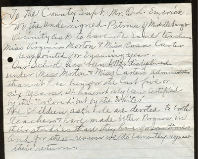 EWP 2-5A Petition Middleburg U 001 Handwritten Petition--Patrons of the Middleburg school and surrounding community petition the School Board to retain Miss Virginia Morton and Miss Rosa Carter as teachers for the next school year. The petition notes that both educators have maintained strong discipline and educational progress over the past five to six years and that the school has received recognition from both Black and white community members. The children are described as devoted to the teachers, and patrons express that the school’s stability and success are due in large part to their leadership. The letter “earnestly” requests that these teachers be reassigned to the same positions.