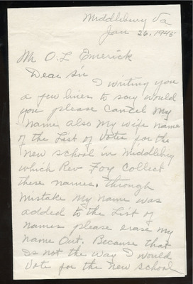 EWP 2-5A Petition Middleburg1945Jan Handwritten Letter- From Charles H Smith, requesting that his and his wife's name be removed from the list of voters for the new school in Middleburg which Rev. Foy collected these names. Through a mistake, Smith indicated his name was added to the list. He requests that their names be erased from the list "because that is not the way I would vote for the new school."