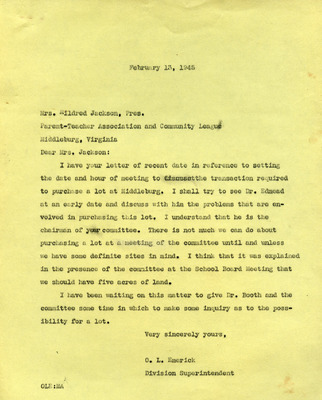 EWP 2-5A Petition Middleburg 1945 001 A typed letter addressed to Mrs. Mildred Jackson, President of the Parent-Teacher Association and Community League, Middleburg, Virginia. The letter responds to her recent inquiry about purchasing a lot at Middleburg for school purposes. The writer notes plans to confer with Dr. Edmead, discusses the need for definite sites before action can be taken, and references prior discussions at a School Board meeting that indicated the need for five acres of land. The letter emphasizes waiting on Dr. Booth and the committee for further inquiry into possible sites.
