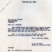 November 12, 1952 correspondence from Superintendent O.L. Emerick to bus driver O. Ray Stewart (Bus #34). The correspondence directs Mr.Stewart to change the route of school bus # 34 which served Carver Elementary (presumed effective for the remainder of the 1952/53 school year).